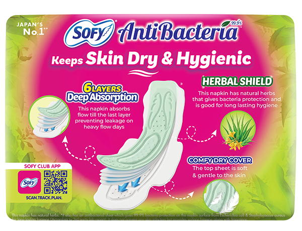 Stay hygienic and comfortable with Sofy’s Anti-Bacteria sanitary napkins, designed to keep you feeling safe & protected. Infused with a unique blend of natural herbs, these pads offer a herbal shield, ensuring safety during your period. Here’s what makes them exceptional: