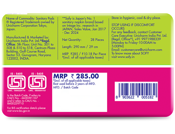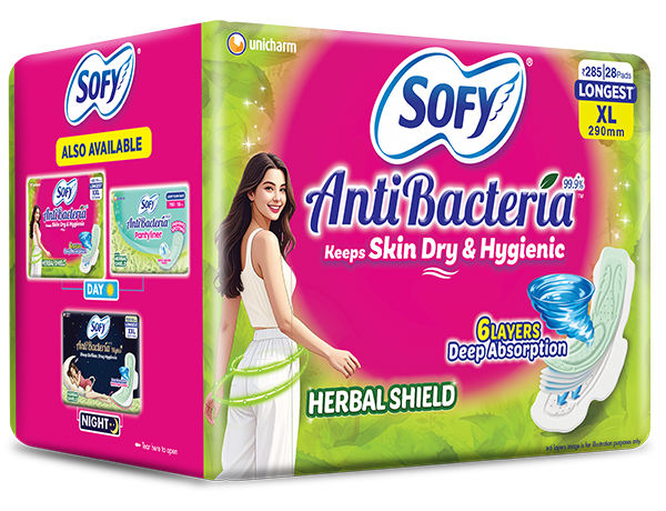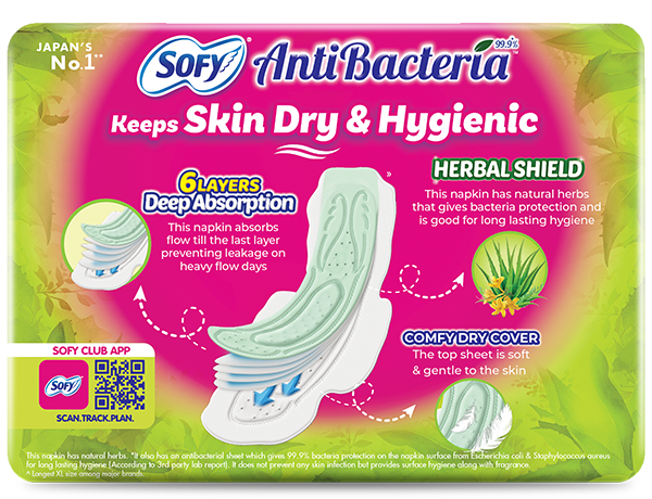 Stay hygienic and comfortable with Sofy’s Anti-Bacteria sanitary napkins, designed to keep you feeling safe & protected. Infused with a unique blend of natural herbs, these pads offer a herbal shield, ensuring safety during your period. Here’s what makes them exceptional: