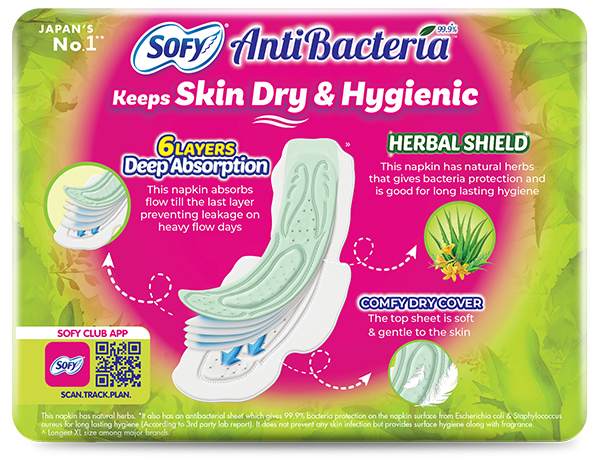 Stay hygienic and comfortable with Sofy’s Anti-Bacteria sanitary napkins, designed to keep you feeling safe & protected. Infused with a unique blend of natural herbs, these pads offer a herbal shield, ensuring safety during your period. Here’s what makes them exceptional: