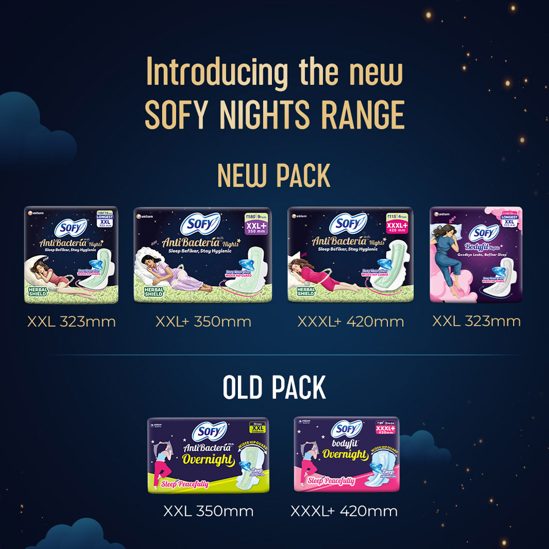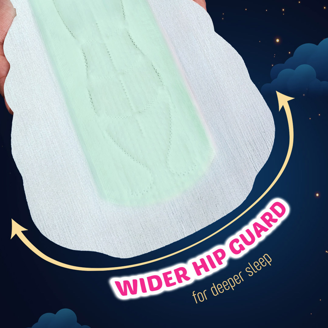 Sofy’s Night Pads with Antibacterial properties, Longest XXXL+ length & a Wider Hip Guard that prevents leakage from sides and back and protection from wetness and dampness caused by heavy flow ultimately giving you a peaceful & undisturbed sleep.