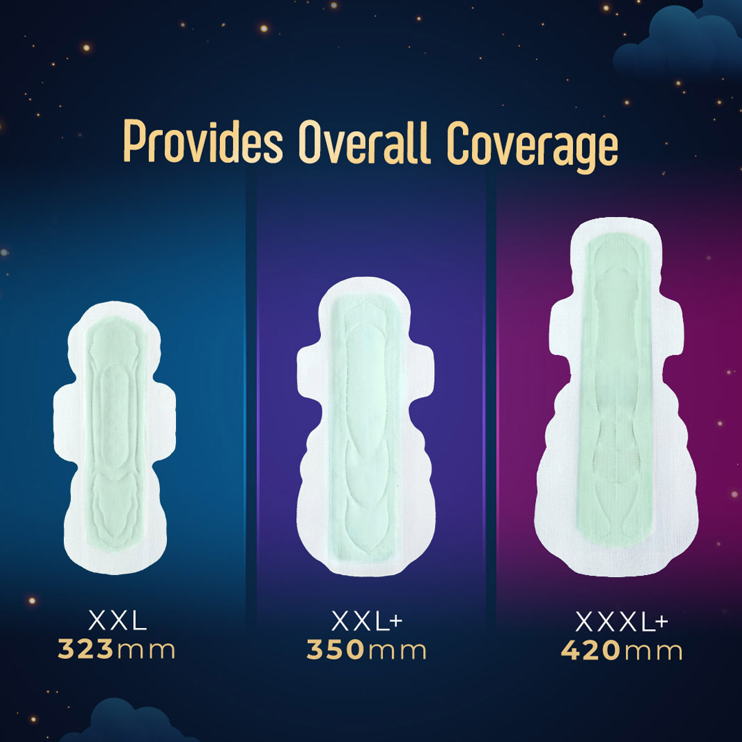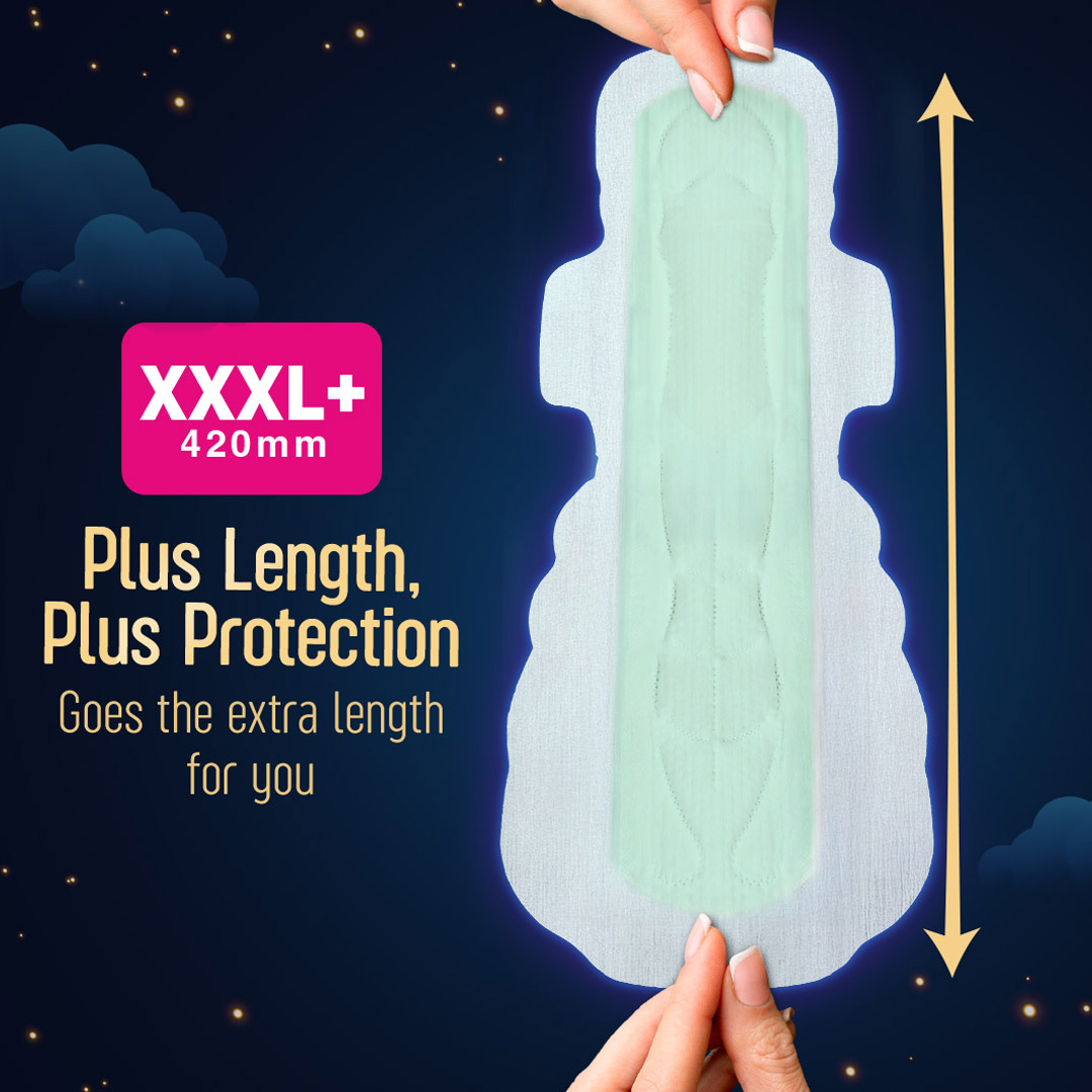Longest XXXL+ length with deep absorption that locks flow till the last layer, ensuring full coverage and leakage protection even on heavy flow days.